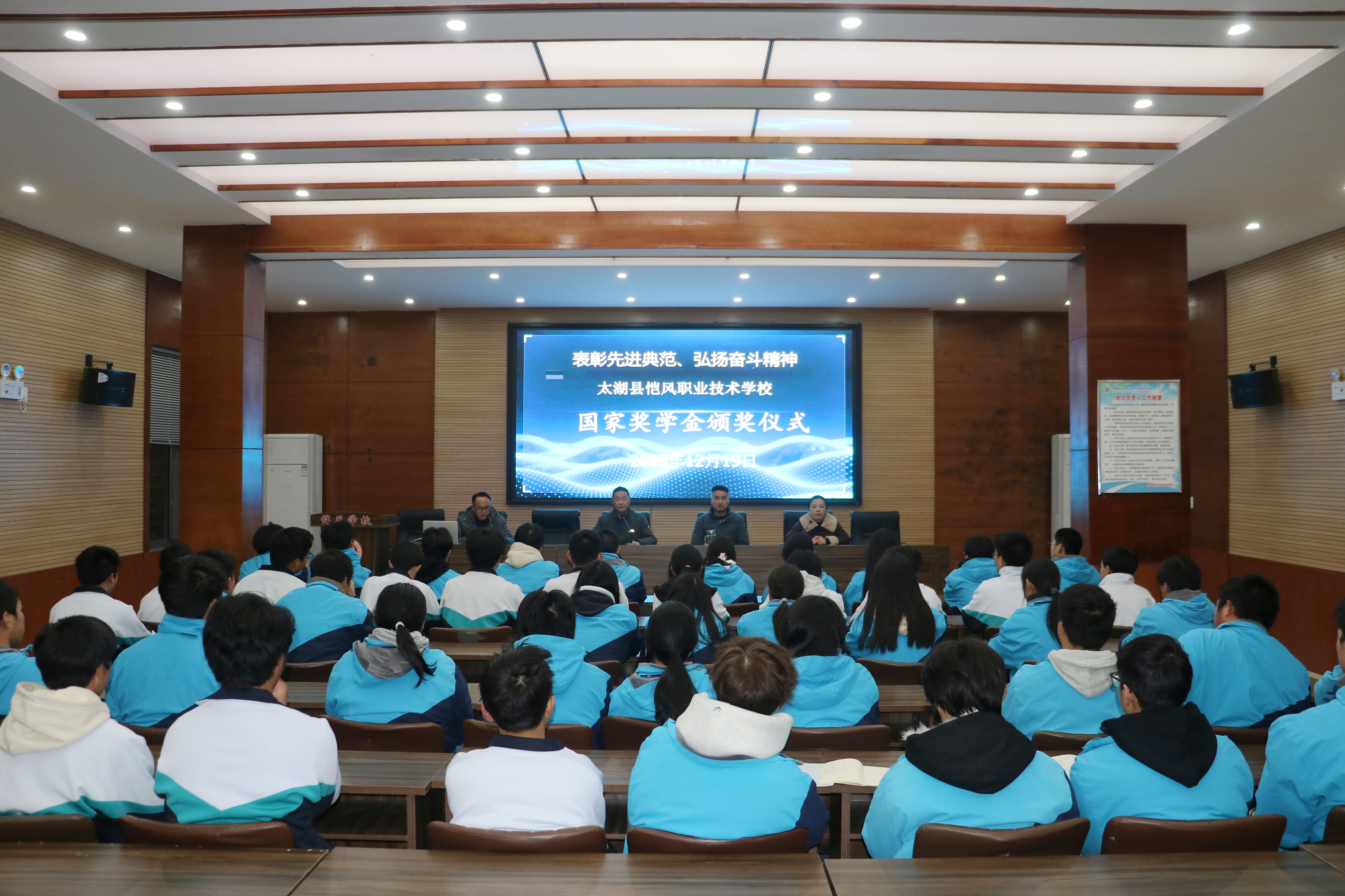 为表彰优秀学子,树立学习榜样,充分发挥国家奖学金的激励导向作用,2025年12月19日,太湖县恺风职业技术学校在多功能厅隆重举行中等职业教育国家奖学金颁奖仪式。学校领导班子成员、班主任代表及获奖学生、学生代表共计70余人参加本次仪式。