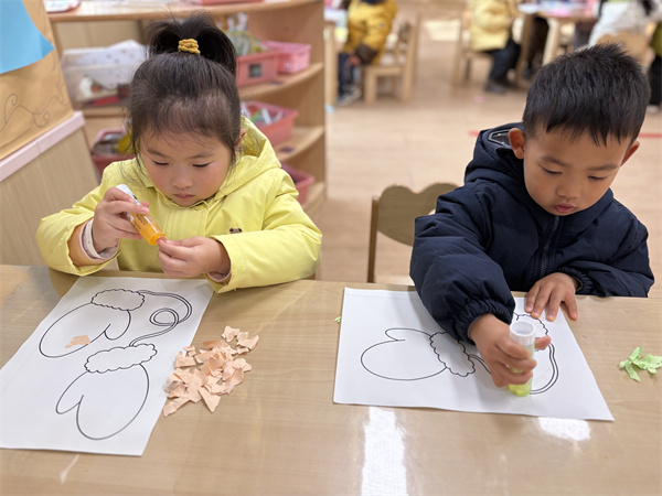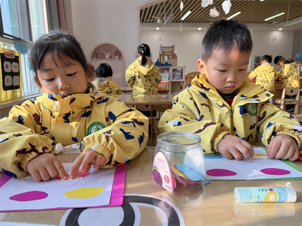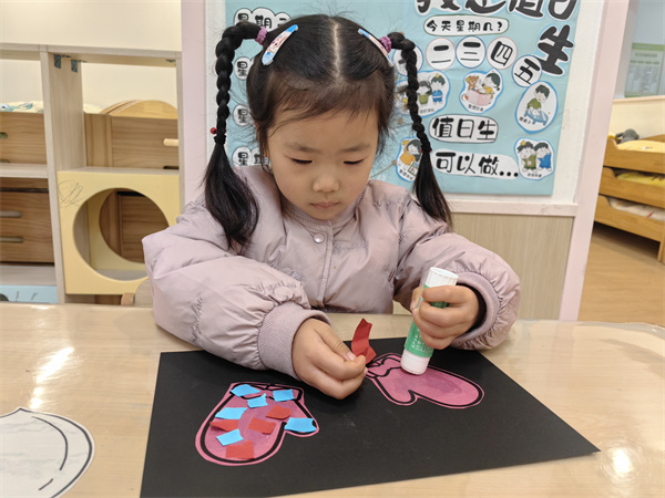 小班的宝贝们聚焦冬日保暖主题,开启了《我的暖暖小手套》手工创作之旅。老师以“冬天的小手冷吗”的情景提问引出活动,通过展示实物手套,让孩子们直观认识手套的形状与保暖用途。随后,孩子们在老师的指导下,用胶棒粘贴棉花、彩色碎纸片和亮片贴纸装饰卡纸手套,稚嫩的小手认真涂抹胶水、按压材料,为手套添上缤纷花纹。完成作品后,孩子们将手套贴在“暖暖墙”展示区,还踊跃向同伴介绍自己的创作,在动手与分享中收获满满乐趣。