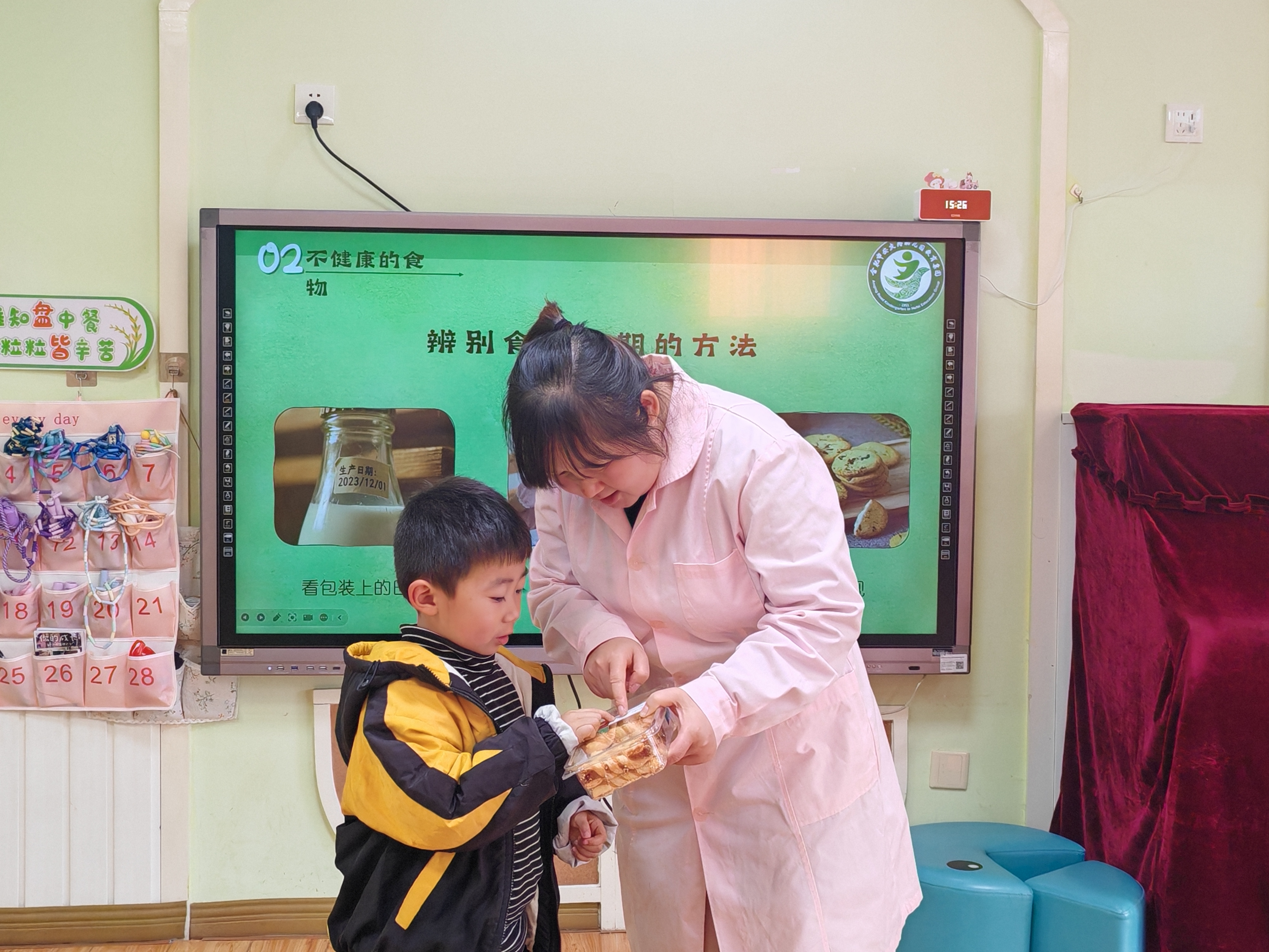 保健老师胡迎年走进班级,开启了一堂生动有趣的食品安全活动,通过互动问答、实物观察、儿歌学唱等形式,让幼儿在轻松愉快的氛围中掌握食品安全知识。