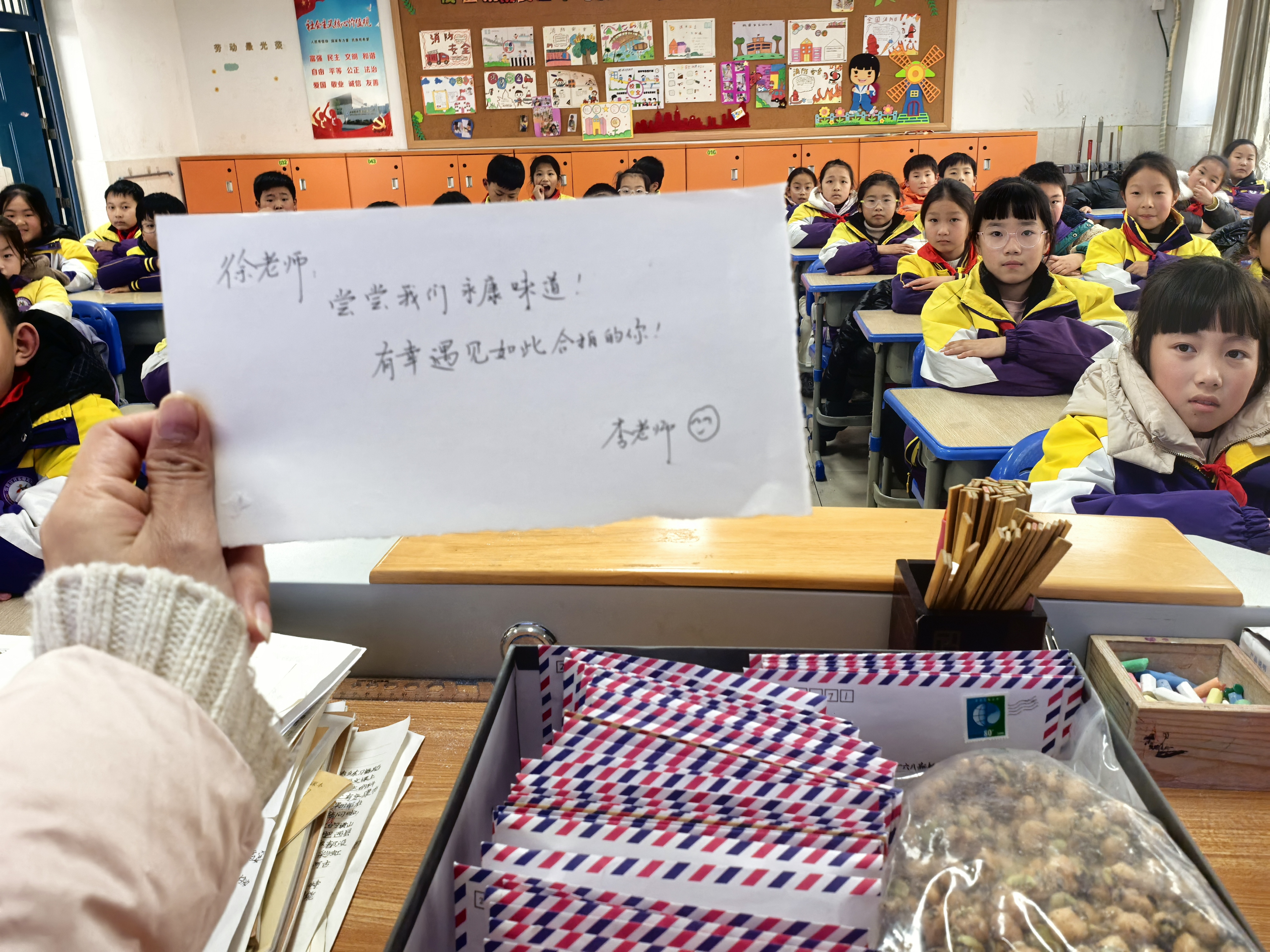 12月29日下午,来自永康的包裹如约抵达。当一封封字迹工整的书信分到孩子们手中,教室里瞬间沸腾。大家小心翼翼拆开信封,细细品读远方伙伴的心声,字里行间满是真诚与善意,每一封信里还有小伙伴准备的小礼物。更让孩子们惊喜的是,永康市人民小学的李老师特意寄来了地道的永康美食——方山柿饼与切糖,软糯香甜的滋味在舌尖绽放,温暖和感动也在孩子们心底蔓延。
