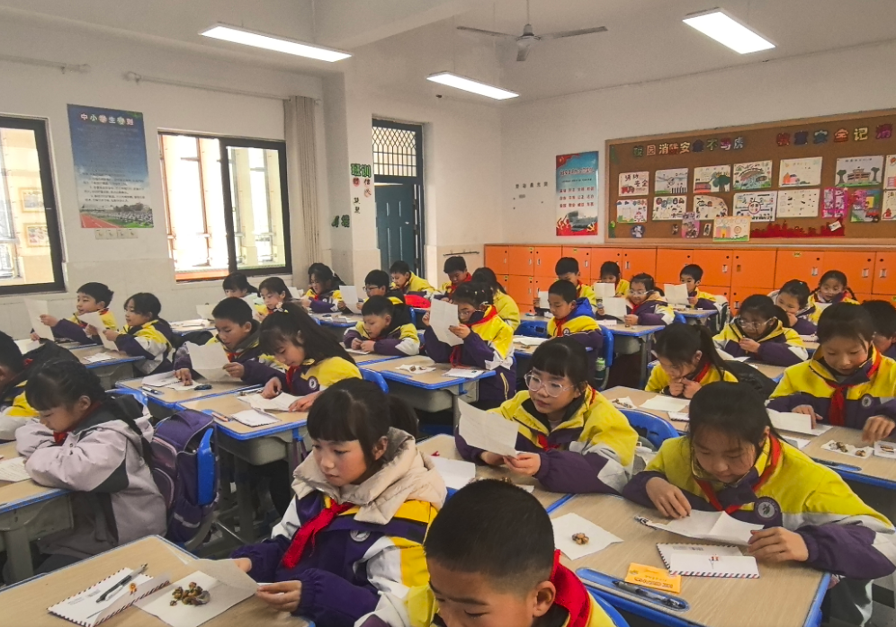 品读完毕,孩子们满怀激动提笔写回信。教室里没有了往日的喧闹,只剩笔尖划过纸张的沙沙声。大家认真核对书信的称呼、祝颂语、署名等每一处格式,回信中既有对远方伙伴的问候、对美食的感谢,也有对自己校园生活的分享,更有对下次书信往来的热切期盼。