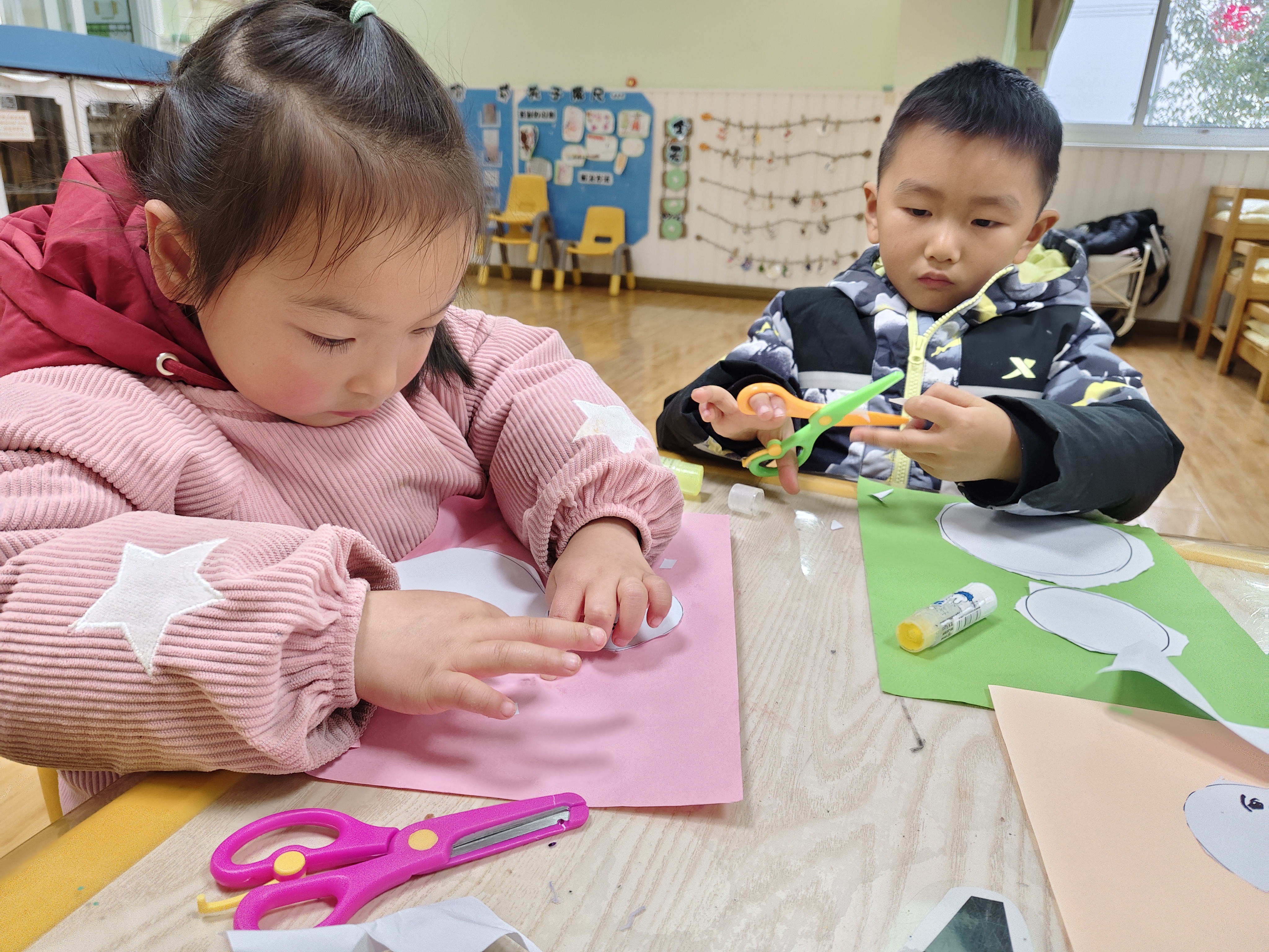 了解了小寒知识后,孩子们迎来了最期待的手工环节——制作小雪人剪贴画。五彩缤纷的卡纸、安全剪刀、胶棒......材料一上桌,孩子们就迫不及待地动起手来。“我要做一个红鼻子的小雪人!”“我的雪人有大大的眼睛和胡萝卜鼻子!”“看,我做的雪人一家,有雪人爸爸、雪人妈妈和雪人宝宝!”在老师们的指导下,孩子们小心翼翼地剪出圆形、三角形、圆形等各种形状,拼贴出一个个形态各异、可爱灵动的小雪人。有的还给雪人添上了围巾、手套,甚至画上了飘落的雪花,创意无限!