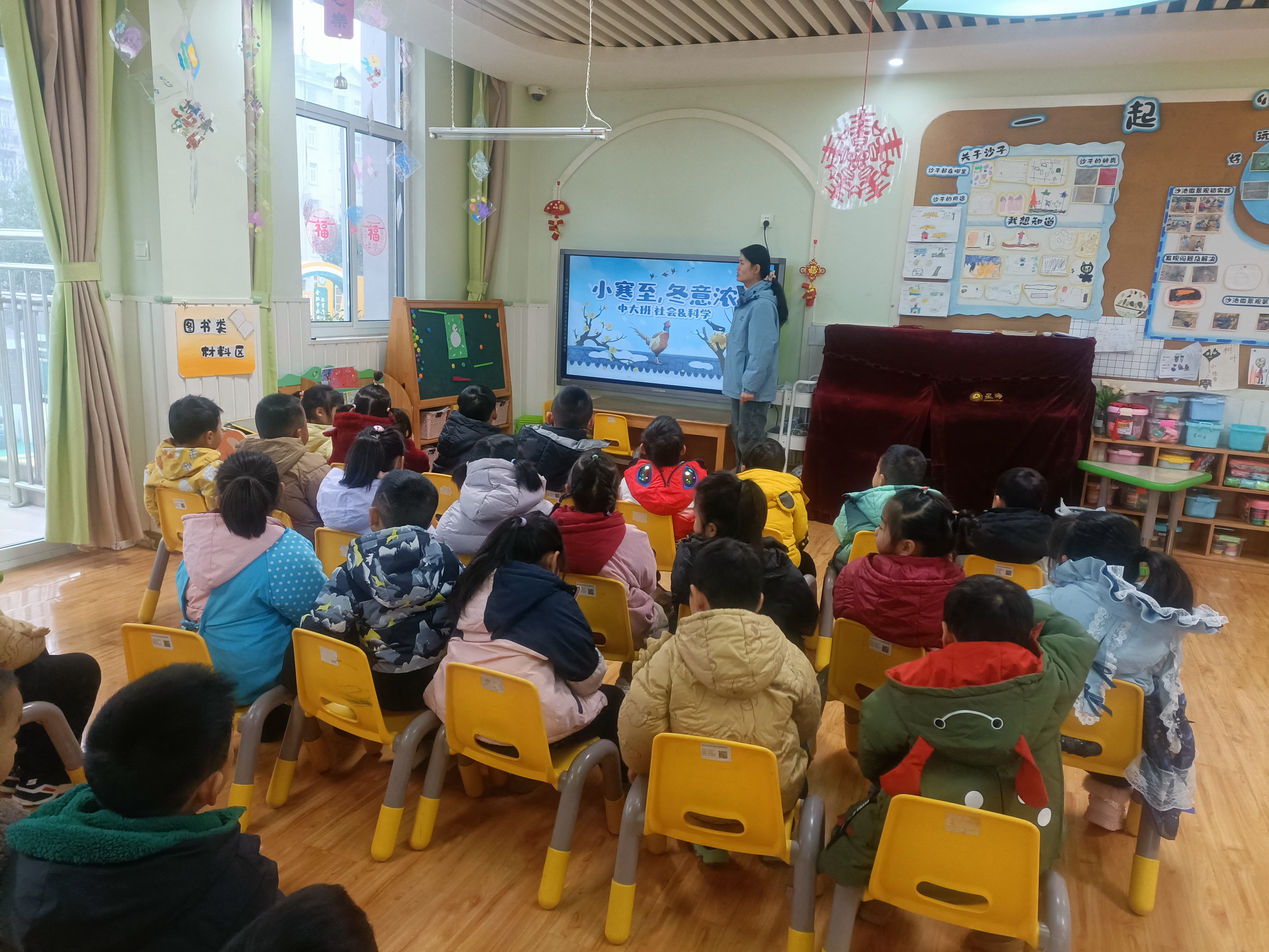 活动伊始,老师准备了图文并茂、生动有趣的小寒节气PPT。通过直观的视频和图片,孩子们了解了“小寒”的由来和气候特点。“原来小寒是一年中最冷的时候呀!”“我看到视频里小动物们都在冬眠呢!”“妈妈说小寒要吃糯米饭,暖暖身体。”孩子们睁大好奇的眼睛,津津有味地学习着小寒的三候、习俗和养生知识。在互动问答环节,大家上前踊跃发言,分享自己了解的冬季小知识,教室里充满了探索的喜悦。