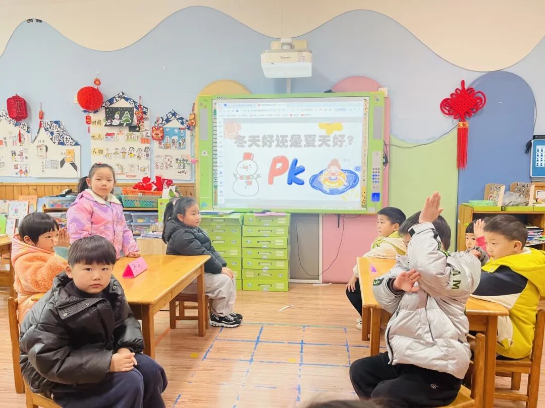 大班组的活动则更加注重思维与表达能力的培养,一场《辩论赛:冬天好vs夏天好》将活动推向高潮。孩子们在晨间活动中通过投票选择立场,随后展开了激烈的辩论。辩论过程中,“冬天队”与“夏天队”的孩子们各抒己见,从堆雪人到游泳,从打雪仗到吃西瓜,双方辩手你来我往,现场气氛热烈。老师们的适时引导,不仅培养了孩子们的逻辑思维,还锻炼了他们的语言表达能力。最终,活动在颁奖环节中圆满结束,孩子们收获了知识与成长的喜悦。