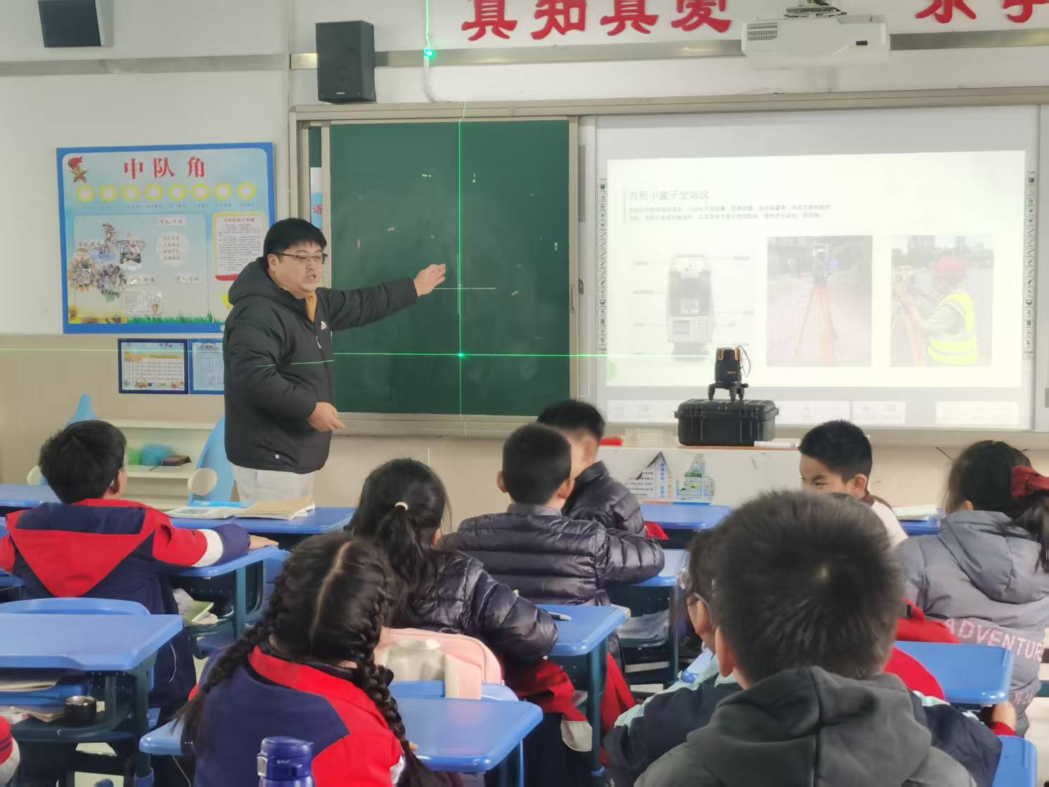 四(8)班邀请王金宸爸爸走进课堂,为同学们带来了一堂“工地测量工具”科普课。课堂上,激光投线仪、水准仪等专业工具化身“工程玩具”,同学们通过观察、操作,亲身体验测量黑板的长度、观测标杆的高度,感受科技在建设中的魅力。王伟用生动比喻讲解工具原理及使用方法。他特别将话题引向数学,强调这门学科远不止于纸上的公式与计算。同学们听后深受启发,这堂别开生面的科普课,让抽象的数学知识变得可触可感,在同学们心中播下了探索科技、重视知识的种子,真正实现了“工地科技零距离”的生动体验。