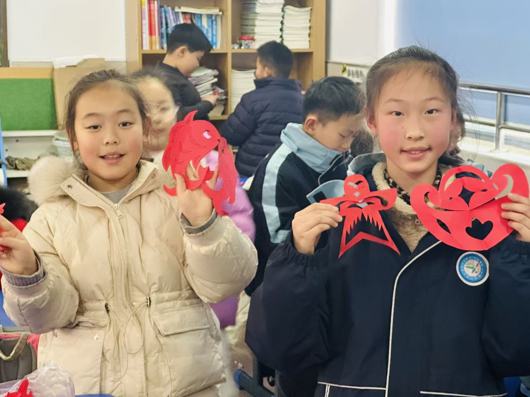 暖意融融的四(1)班教室里,一场别开生面的剪纸课堂欢乐启幕。鲍梓瑄姑姑与王诚杰妈妈化身“非遗导师”,他们手持红纸与剪刀,耐心地向孩子们传授剪纸的技巧——从折叠纸张的角度,到勾勒图案的线条,再到裁剪时的力度把控,每一个步骤都讲解得细致入微。孩子们围在两位家长身边,眼神里满是好奇与期待,纷纷拿起工具动手尝试,在指尖的翻飞中,一张张普通的红纸渐渐变成了活灵活现的窗花、小动物,教室里不时响起惊叹声与欢笑声,传统文化的种子也在这动手实践的乐趣中悄然播撒。