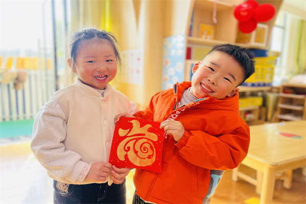 中班小朋友化身 “福字传情小使者”。教师引导孩子们认识 “福” 字并了解福字背后承载的美好祝愿。随后小朋友们通过拓印或涂色制作专属福字。完成后,小朋友们带着作品前往小班,向弟弟妹妹赠送福字并送上新年祝福,在传递温暖的过程中体验关爱他人的快乐,同时提升语言表达能力。