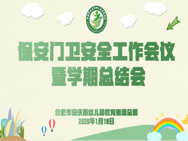 为切实加强幼儿园安全管理工作,及时排查消除各类安全隐患,全力保障师幼生命财产安全,营造平安和谐的校园环境,在李峥总园长的统一安排部署下,合肥市安庆路幼儿园教育集团总园召开一月校园保安门卫安全工作会议暨学期总结会,房静玥副园长、后勤负责王静静老师带领全体安全小组及安保人员参会。