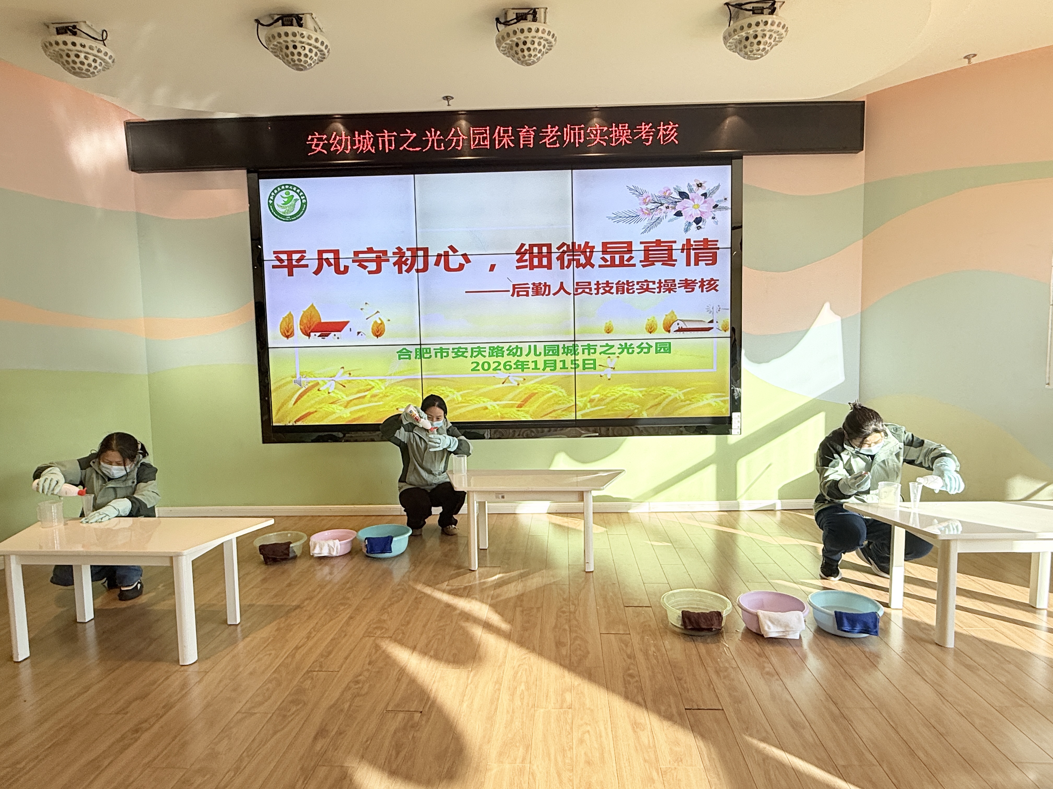 为深化“保教结合、教养并重”理念,全面提升保育队伍专业技能水平。近期,合肥市安庆路幼儿园教育集团城市之光分园集中开展保育后勤技能考核活动,通过“理论+实操+故事讲述”多维考核模式,以赛促练、以评促优,为幼儿保育工作提质增效。