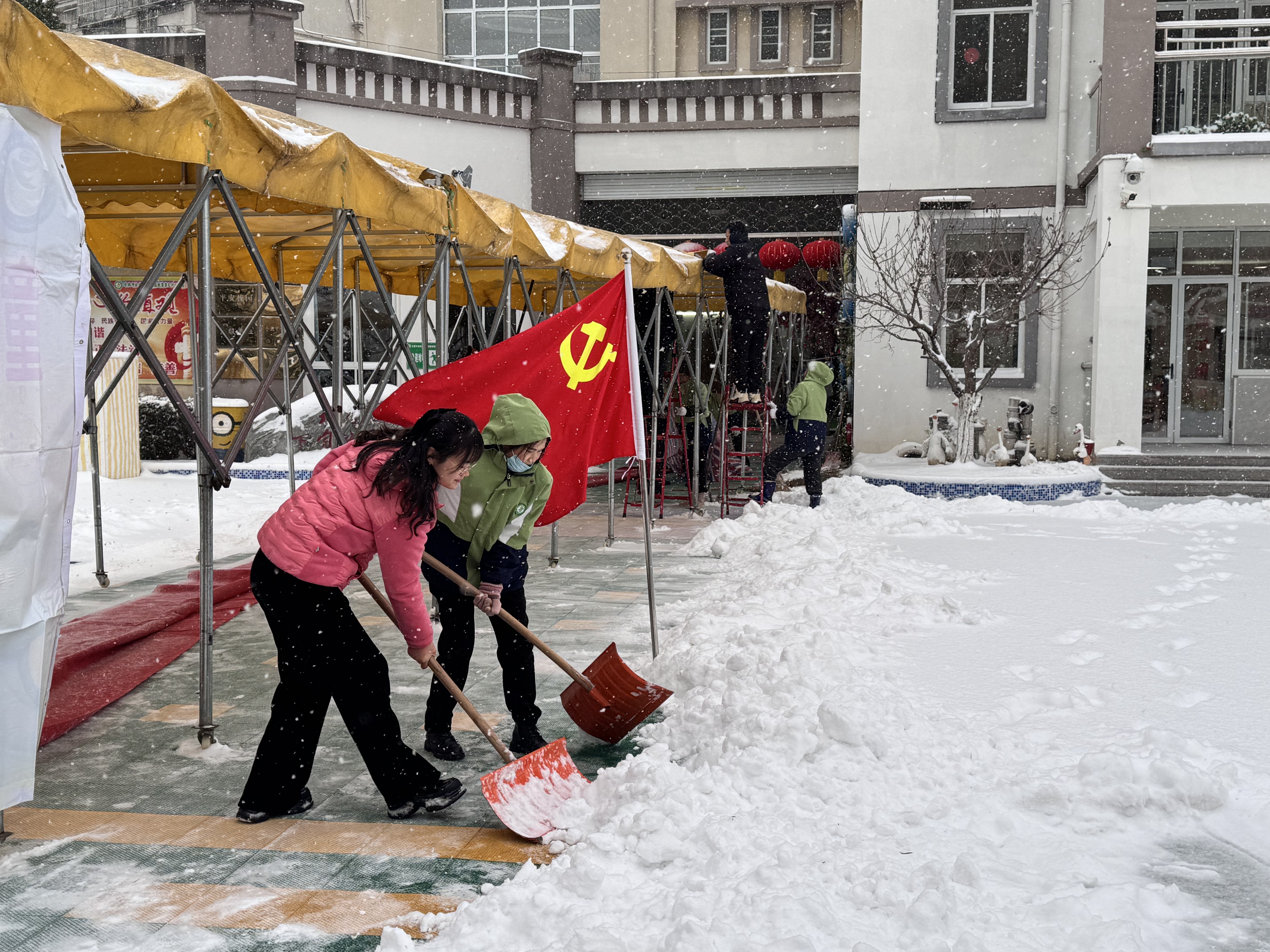清晨,寒气逼人。安庆路幼儿园党支部全体成员在李峥书记的指挥下,带领团队率先到岗,科学划分责任区域,分发除雪工具。党员教师们胸前的党徽在雪地中格外醒目,她们主动承担了门厅台阶、主干道斜坡、户外大型器械区等关键且厚重的积雪清理任务。铁锹与冰面的撞击声、扫帚清扫的沙沙声,奏响了一曲铿锵有力的劳动乐章。团员和保育教师们默契配合,干劲十足。尽管双手冻得通红,但大家没有丝毫懈怠,心中只有一个共同的信念:一定要在孩子们来园前,把路清出来!本次行动中,地处偏远的桃蹊分园教职工们,尤为令人动容。她们克服了更为严峻的通勤困难。为了能尽快到岗清雪,天未亮就已从市区出发,顶风冒雪,驱车数十里赶往园所。她们用行动深刻诠释了“教育无远近,守护皆同心”的教育精神,确保了即便在最偏远的园区,安幼的守护也绝不缺席。