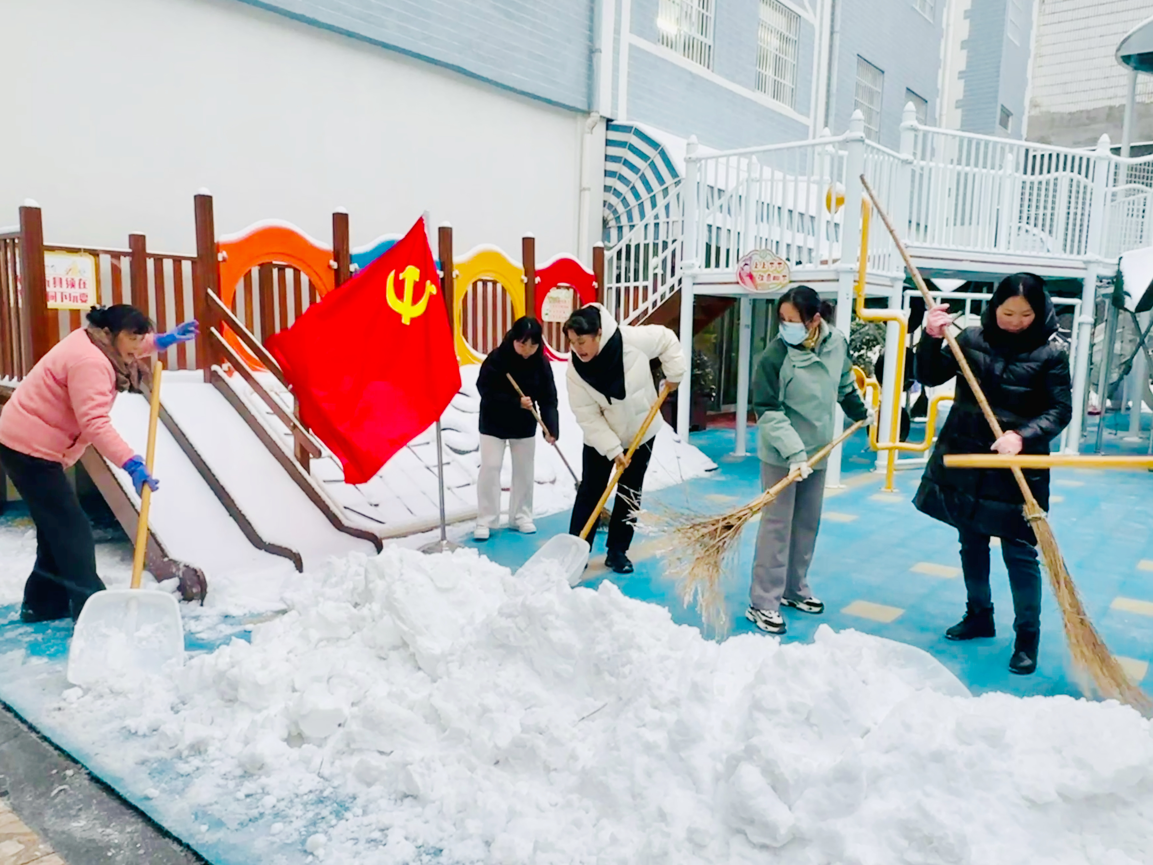 经过全体党团员的齐心奋战,集团各园区主要通道、活动场地、接送区域的积雪和冻冰被彻底清除,并铺设了防滑垫。当幼儿园第一位幼儿牵着家长的手,稳稳地踏进干净整洁的园区时,迎接她们的是老师们无比温暖的笑容。家长们纷纷点赞:“这么厚的雪,没想到幼儿园门口的路这么干净,老师辛苦了!”