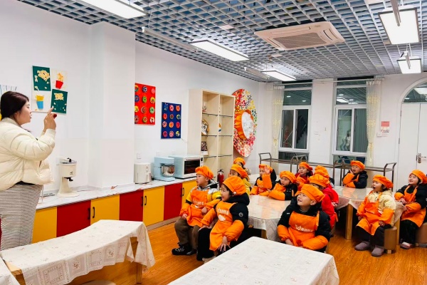 系上小围裙、戴好保暖手套,“小小美食家”们分工协作。清洗环节,孩子们仔细揉搓食材,将雪日的清冷隔绝在外;切配环节,大家握着安全餐刀小心操作,还念叨着“切小一点,煮得更快更暖”。窗外雪花越下越密,室内却热气腾腾,笑声与工具碰撞声交织成温暖的劳动赞歌。
