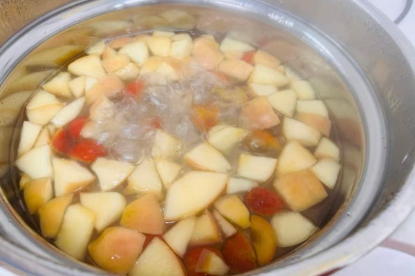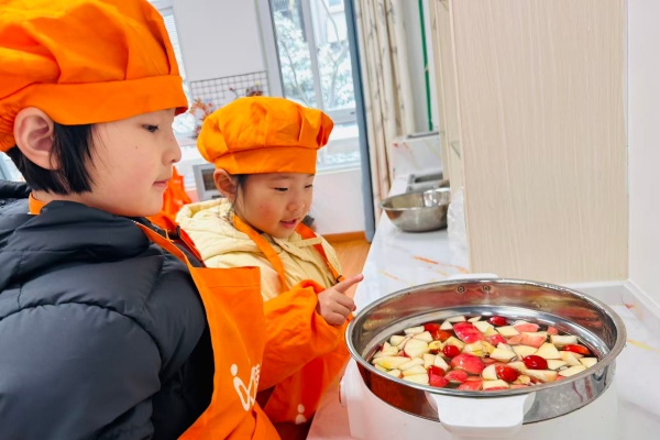 食材入锅后,孩子们围在灶台旁,看着山楂与苹果在沸水中释放酸甜汁液,雾气氤氲里,小脸蛋被映照得红扑扑的。香气弥漫开来,与窗外的雪景相映,让这份温暖更显珍贵。温热的山楂苹果水分装后,孩子们捧着杯子小口品尝,暖意瞬间蔓延全身。