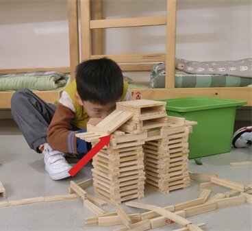 北北专注完善建筑造型,认真观察并全程投入搭建,不断调整积木位置以稳固结构,将木条精准嵌入堆叠的结构中,但是斜顶的教学楼总是塌掉。