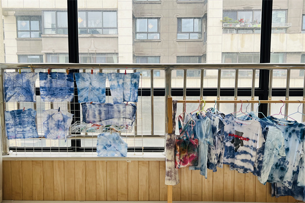 晾干后,幼儿轻轻解开皮筋,一幅幅独一无二、色彩斑斓的扎染作品惊艳呈现,幼儿互相欣赏,分享创作的喜悦。