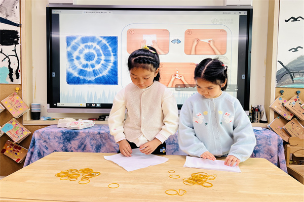 活动中,老师通过讲解与示范,向孩子们介绍了扎染的历史、工具和基本步骤,激发了幼儿的探索兴趣。幼儿化身小小艺术家,将方巾精心折叠、扭结,并用皮筋紧紧固定,再小心浸染、点染喜爱的色彩。