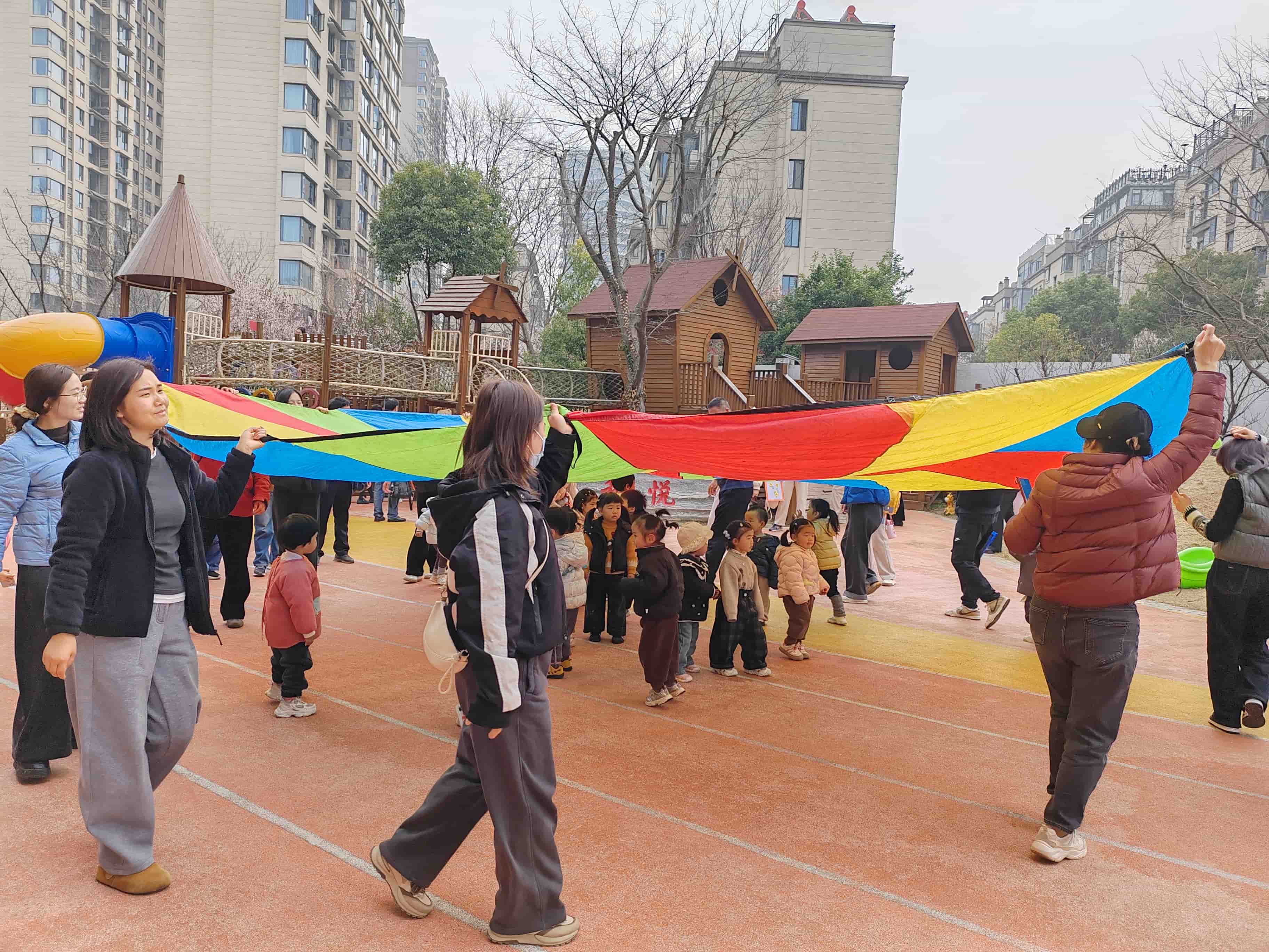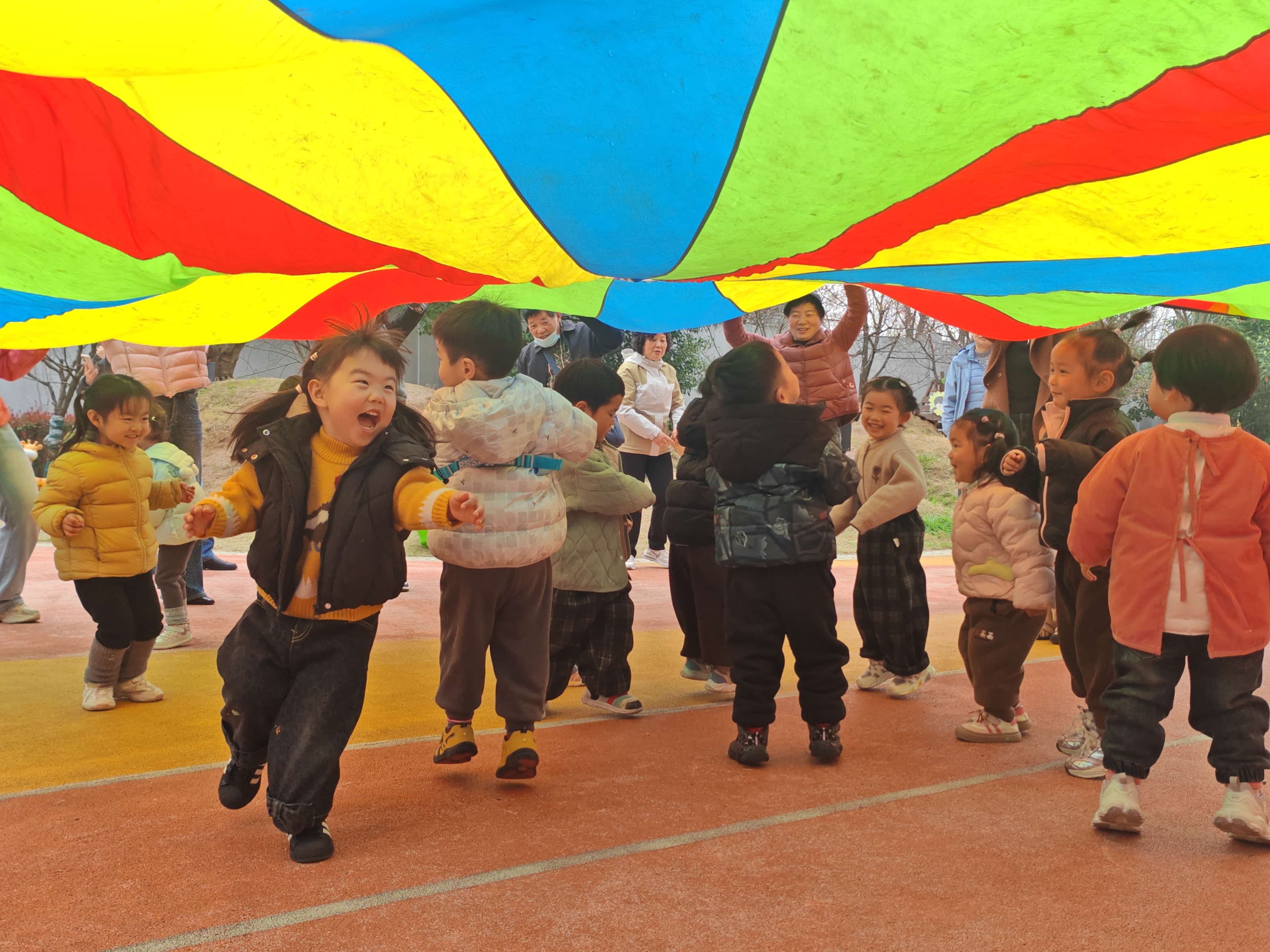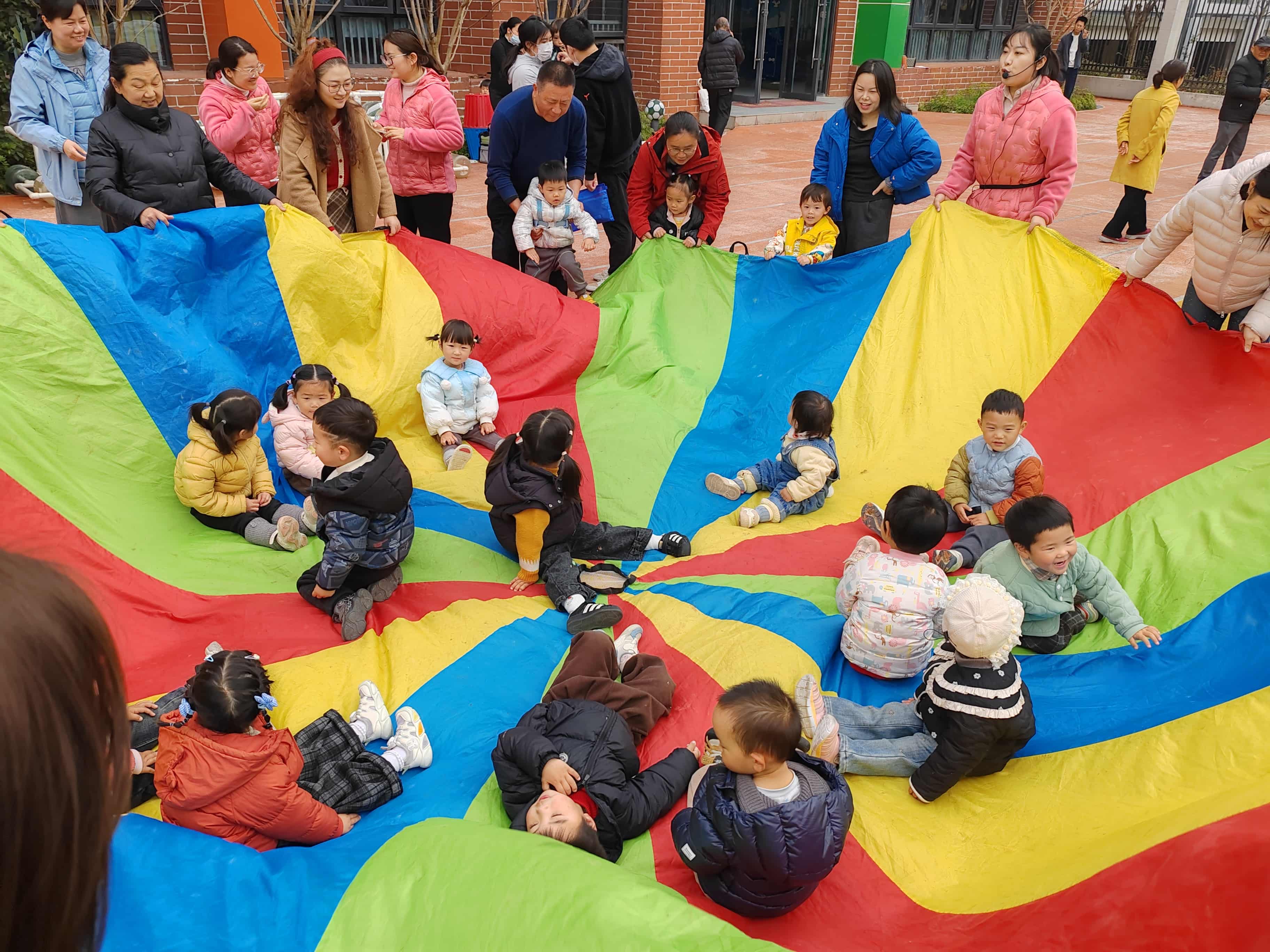 活动现场,户外闯关游戏区率先拉开了欢乐序幕。色彩鲜艳的彩虹伞一铺展开,便吸引了孩子们的目光。在老师的引导下,家长与孩子手拉手握住伞边,跟着口令一起抖动、旋转、起落。彩虹伞时而化作起伏的波浪,时而变成温馨的小帐篷,孩子们在伞下追逐欢笑,家长们也重拾童趣,与孩子亲密互动、默契配合。