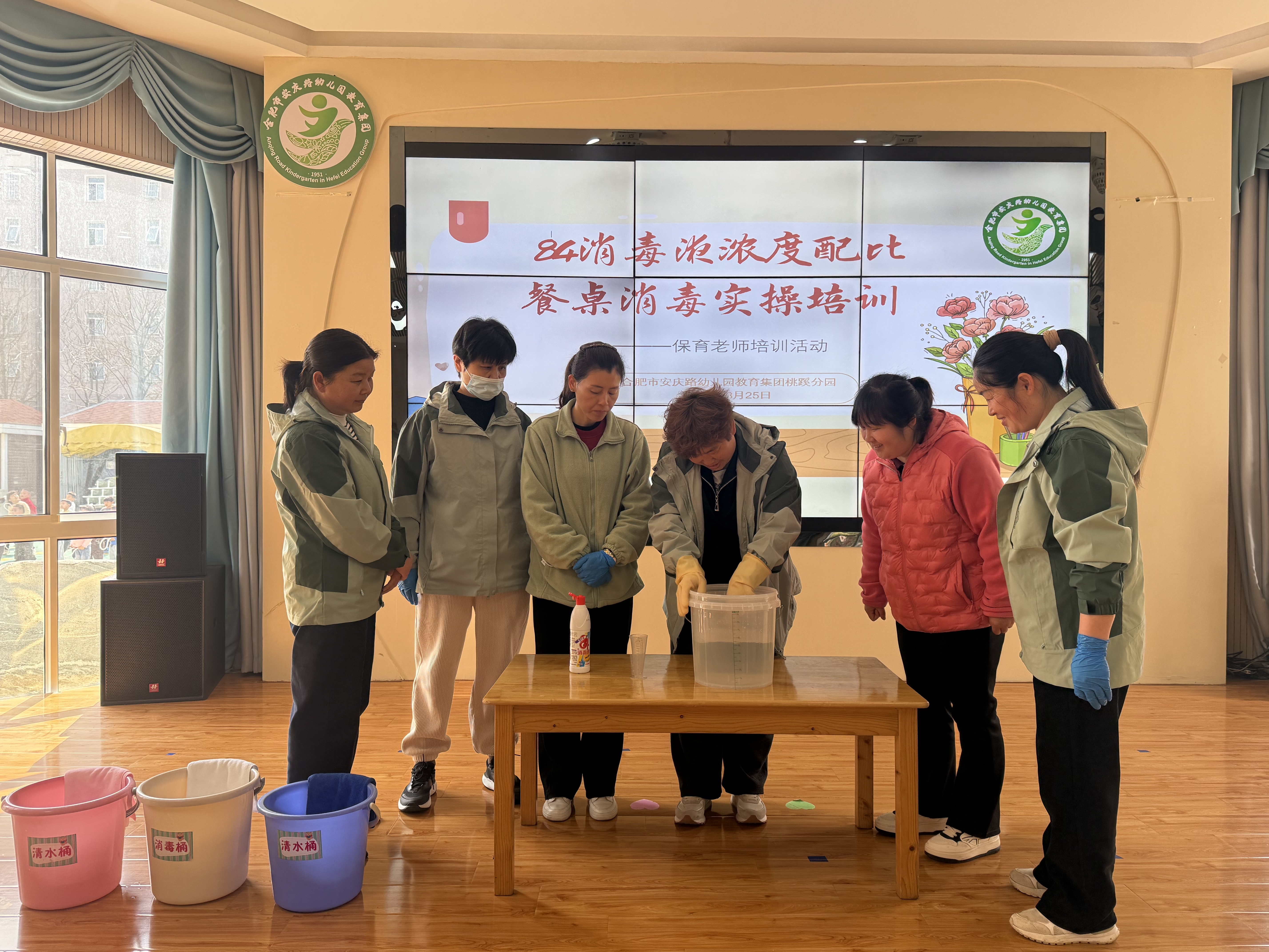 在环境和物品预防性消毒培训及实操中,胡老师系统讲解空气、餐具、玩具、物体表面等各类场景和物品的预防性消毒方法,重点开展消毒液精准配比、标准化消毒流程等实操教学,通过现场示范、手把手指导、全员实操演练,让保育员熟练掌握科学消毒技巧,明确不同场景消毒操作要点,切实提升保育员卫生消毒实操能力,从源头筑牢幼儿园卫生安全防线。实操结束后,胡老师以“我们每天重复的不是简单的劳动,而是专业和爱心构成的守护仪式”作总结寄语,引发全体保育员共鸣。大家纷纷表示,此次培训让工作流程更清晰、操作标准更明确,后续会将规范融入每日工作,用专业与爱心守护幼儿成长。