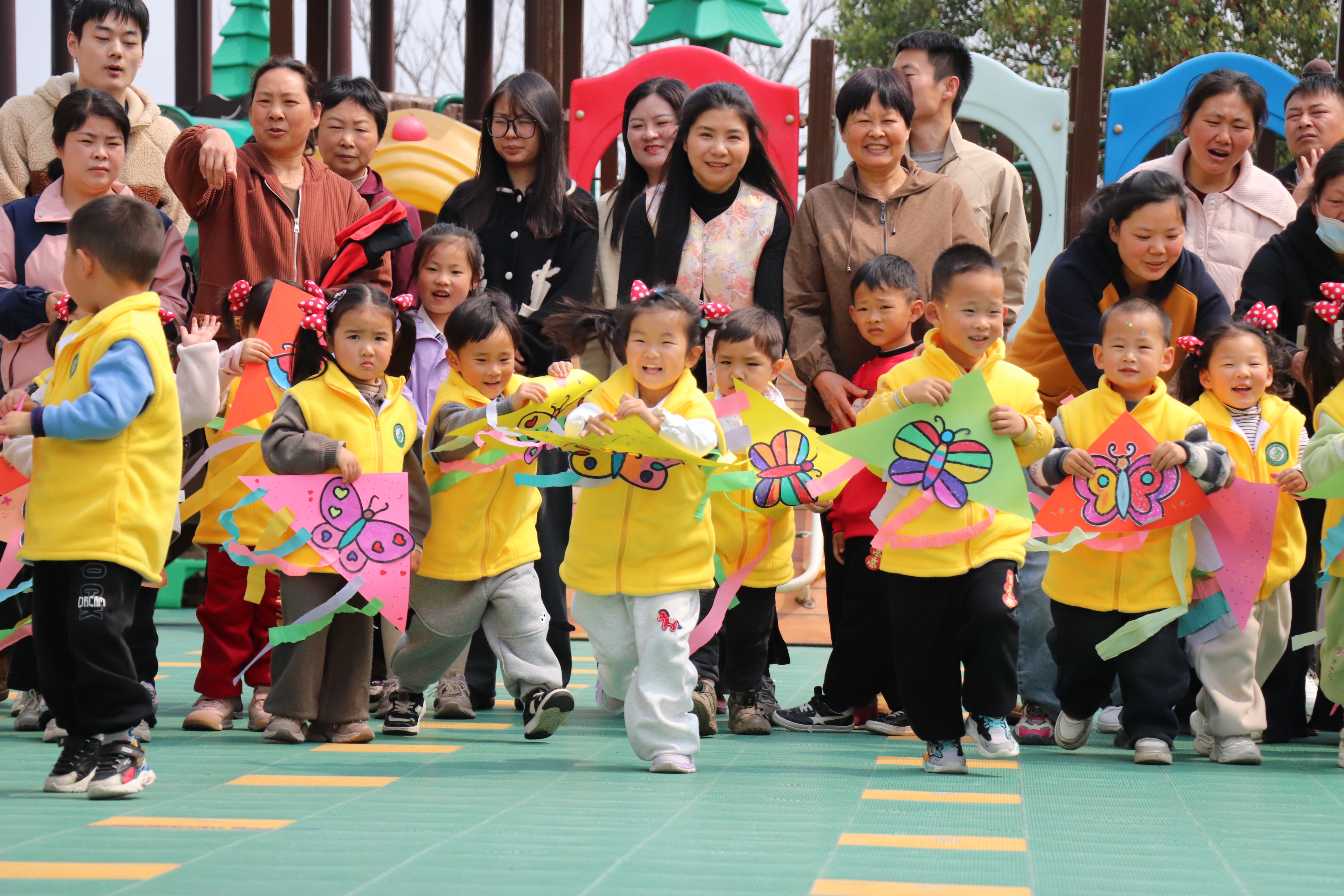 托小班的萌娃们,他们化身一只只可爱的小动物,在动物模仿操中蹦蹦跳跳、摇摇摆摆,稚拙的动作萌态十足。本学期新投入的小沙锤轻器械成为孩子们的“好伙伴”,他们跟随老师挥舞沙锤,沙沙声伴着清脆的笑声洒满操场。彩虹伞游戏更是将气氛推向高潮,孩子们在伞下钻来跑去,时而探出小脑袋,时而围着彩虹伞转圈,欢声笑语回荡在整个校园。