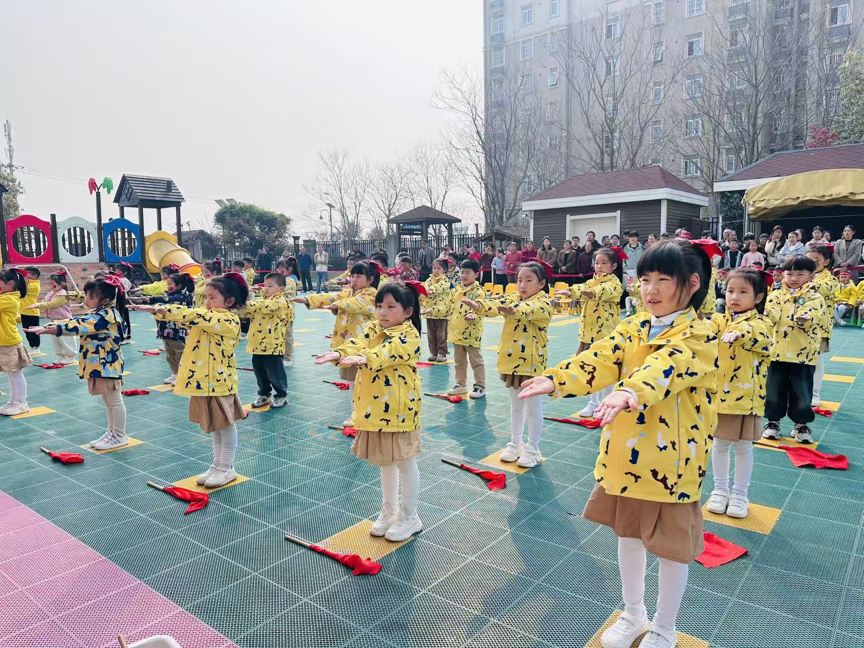 一日之计在于晨,早操是幼儿一日生活中不可或缺的重要环节,既能有效锻炼幼儿的运动能力,也能帮助他们唤醒身体、舒展身心。伴随着欢快的旋律,安幼桃蹊分园的萌娃们精神抖擞、笑靥如花,迎着和煦的春风,在春日暖阳下尽情绽放光彩。