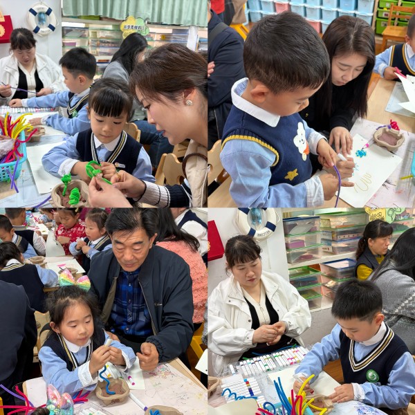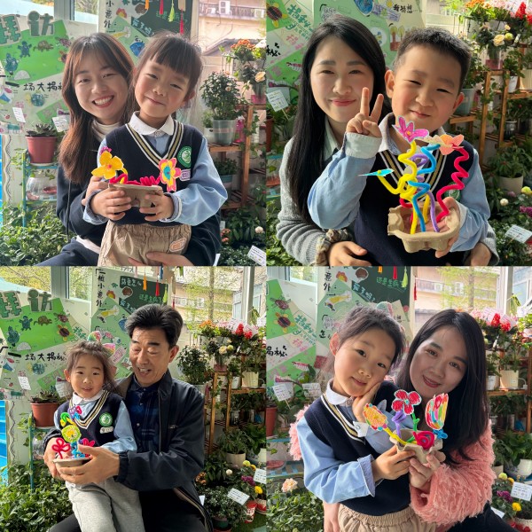 中班则进行了“我的春日小花园”扭扭棒立体手工活动,孩子们在家长的辅助下,用扭扭棒制作花茎、卡纸绘制并裁剪花朵,共同完成了专属春日花园。孩子们兴奋地举着作品向同伴展示,家长们则用手机记录下这充满创意的瞬间。