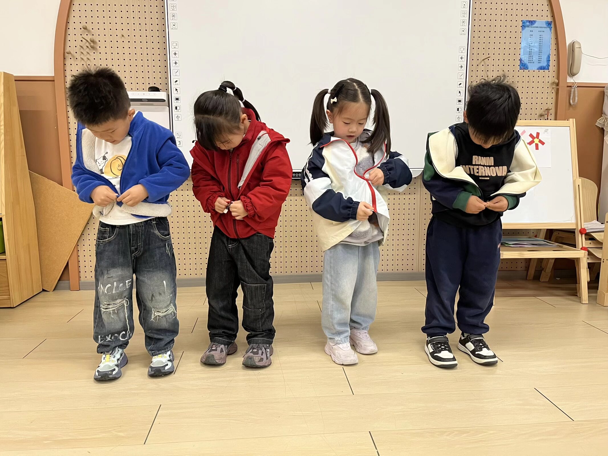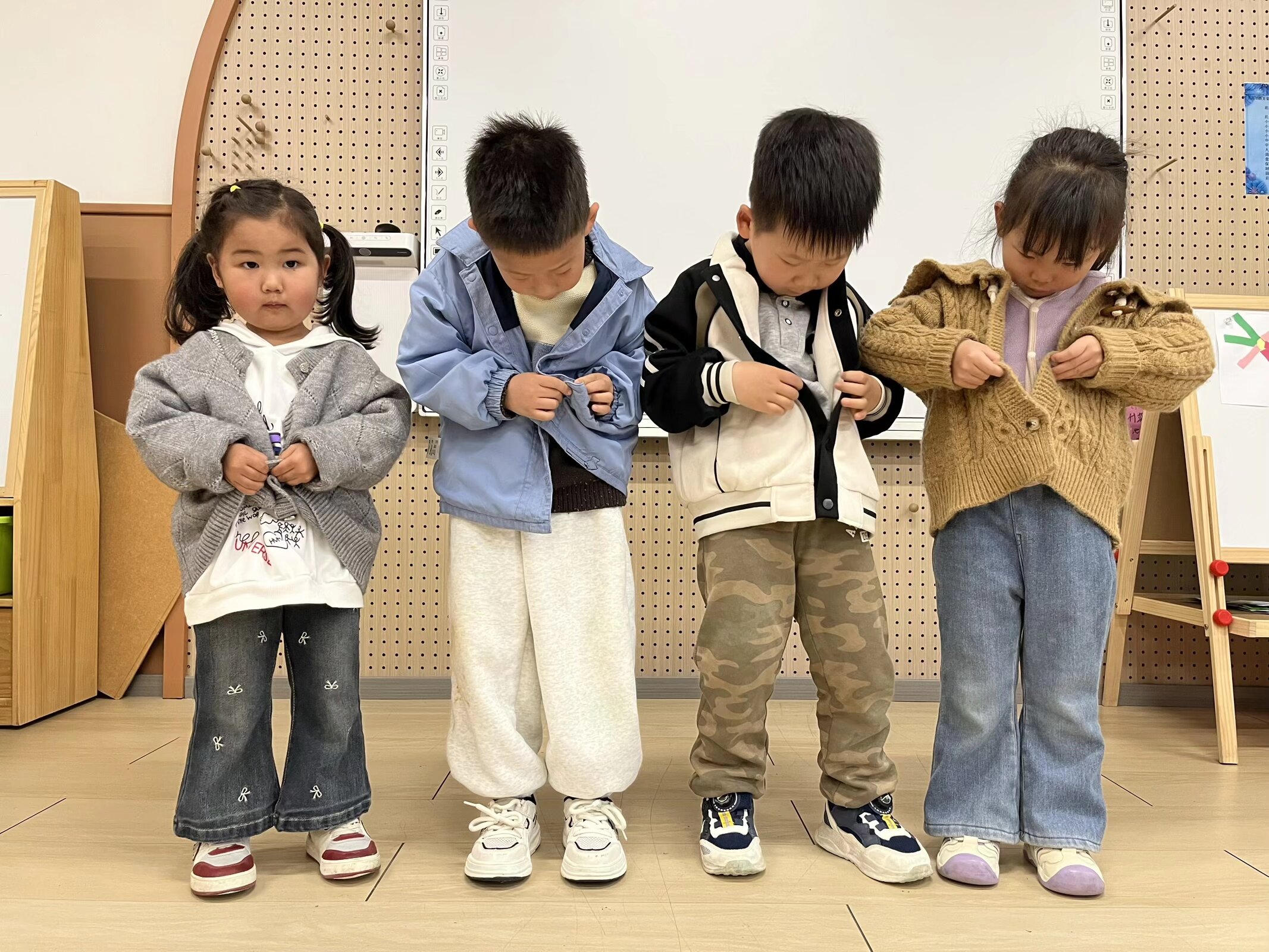 小四班开启“穿衣挑战”,跟着老师学习拉衣服拉链、扣简单的扣子,在动手操作中克服困难,掌握穿衣小技巧,用独立的行动展现成长的模样。