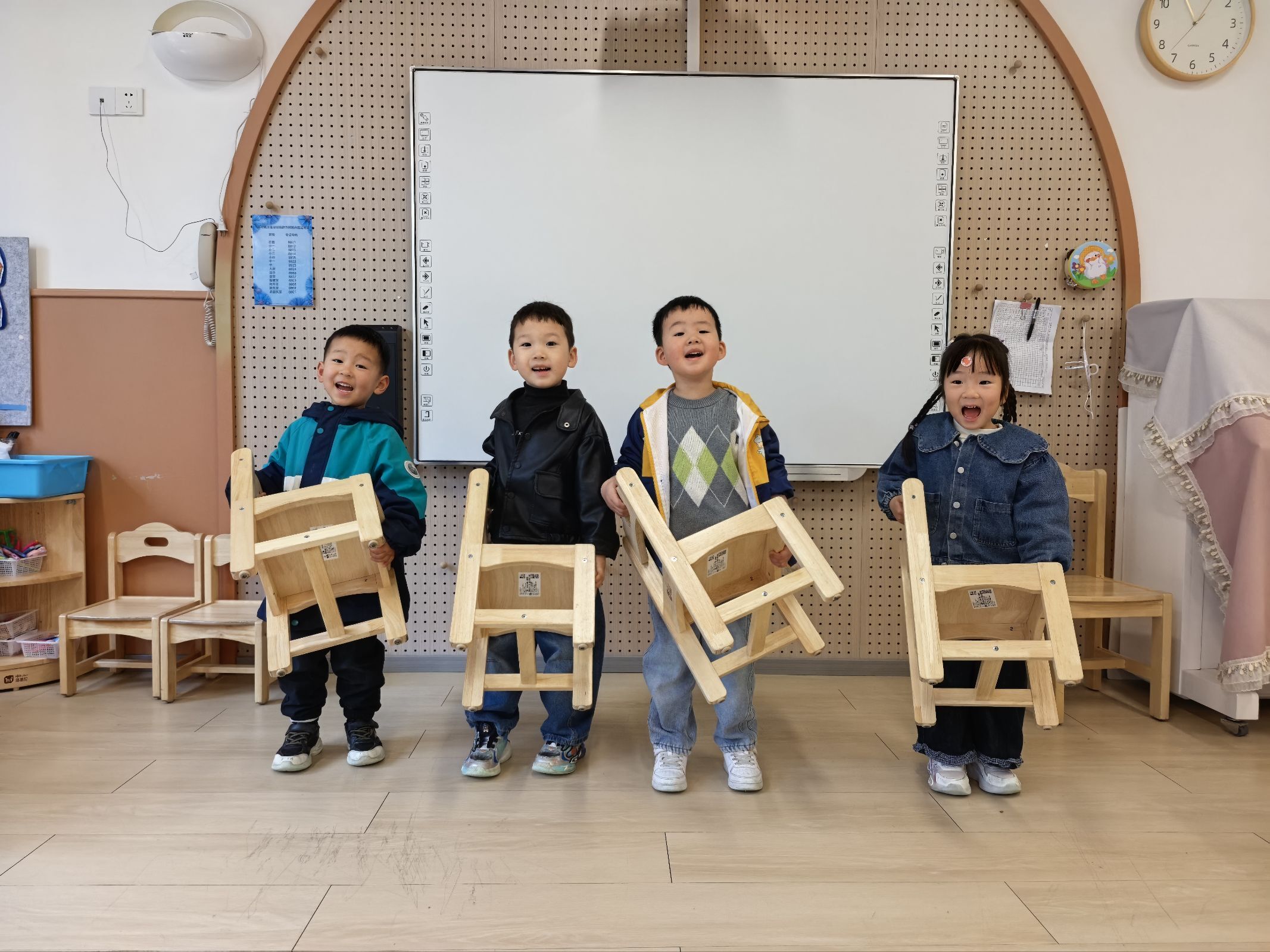 小一班的孩子们专注练习“穿脱鞋子”,跟着儿歌口诀学会给鞋子“找朋友”并摆放整齐,还能自己独立搬小椅子,轻拿轻放归位,在反复练习中让小手更灵活,自理本领悄悄提升。