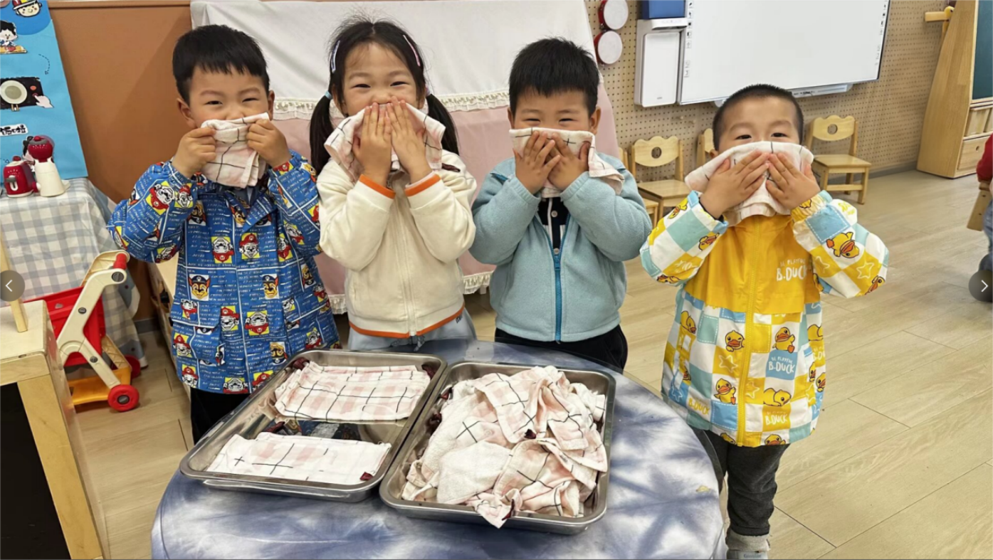 小二班开展“整理小能手”比拼,孩子们认真学习叠手帕、整理绘本,把自己的小毛巾叠得方方正正,将看完的绘本按标记送回书架,在劳动中体会成就感。