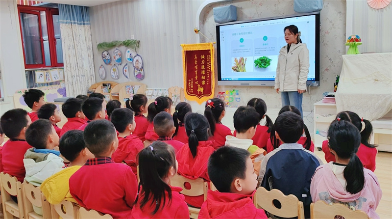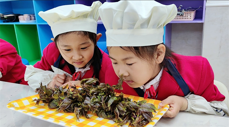 活动伊始,教师结合大班幼儿年龄认知特点,运用实景图片、实物香椿开展谷雨科普小课堂,讲解谷雨节气气候特点、农耕民俗与养生常识,重点介绍“谷雨吃春”的传统渊源,引导幼儿认识香椿外形、香气与食用价值。孩子们通过看一看、闻一闻,在互动中了解节气知识,感受时令物产特色,激发对传统民俗与自然生活的探索兴趣。