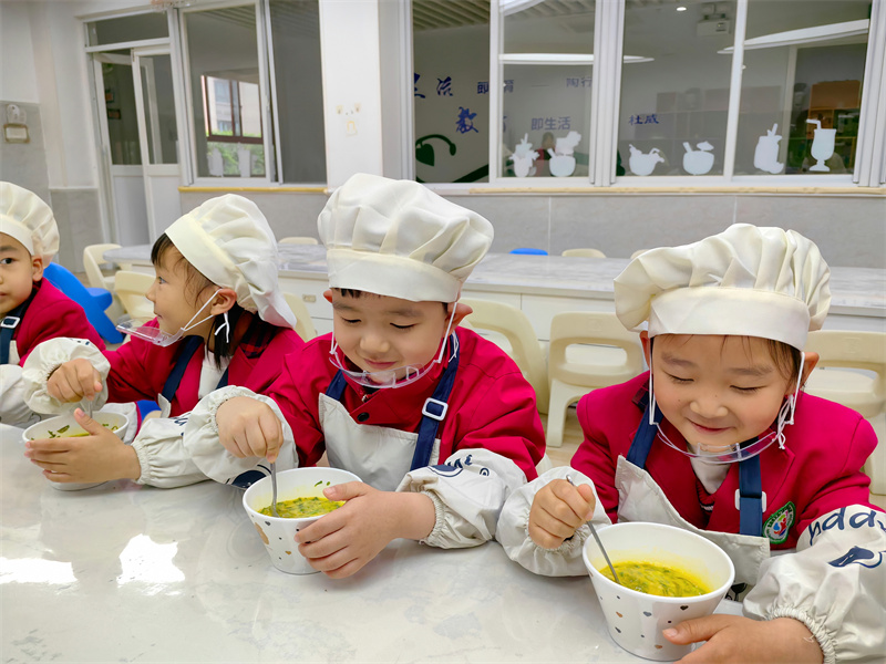 最治愈的莫过于共享春日鲜香时刻,孩子们有序自主取餐,小口慢尝亲手制作的香椿鸡蛋饼,鲜香不腻、口感松软,独特的春日风味深受大家喜爱。你一言我一语分享舌尖美味,畅谈动手制作的快乐收获,脸上洋溢着满满的成就感与幸福感,温馨烟火氛围铺满班级每一处角落。