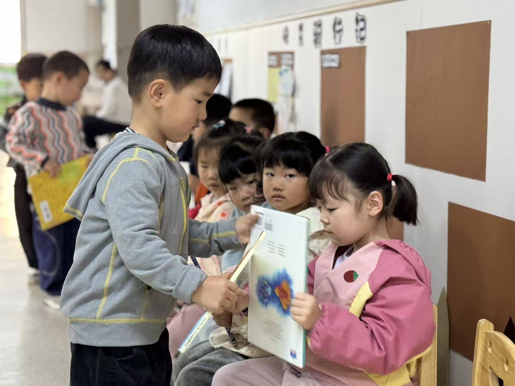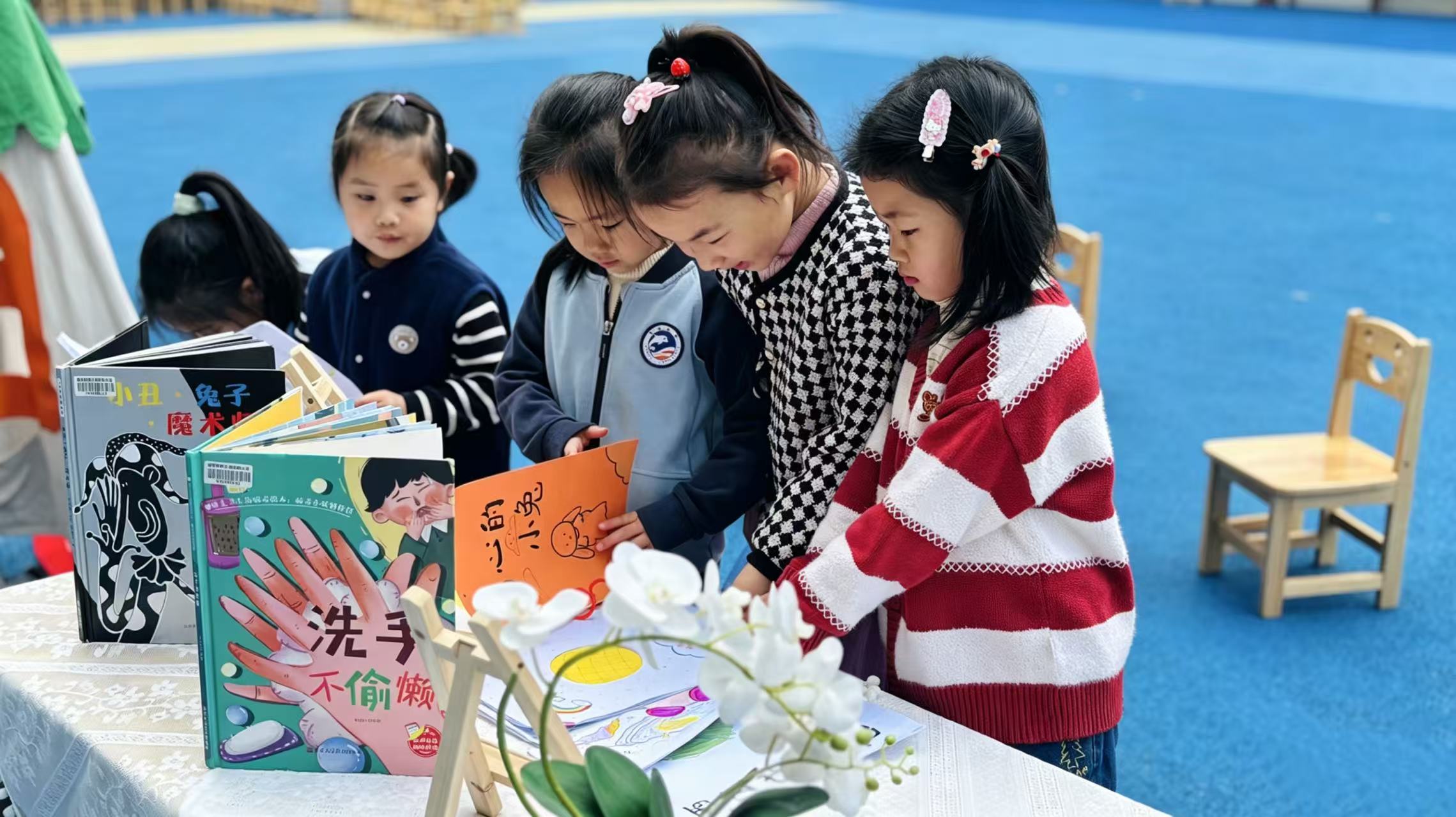 4月24日,幼儿园的户外操场也格外热闹,一场“云宝童阅会”上,大班哥哥姐姐们的绘本剧表演吸引了小观众们的目光,中班的自制绘本见面会、大班的春日诗会等互动区域,让幼儿在互动中体验阅读乐趣。